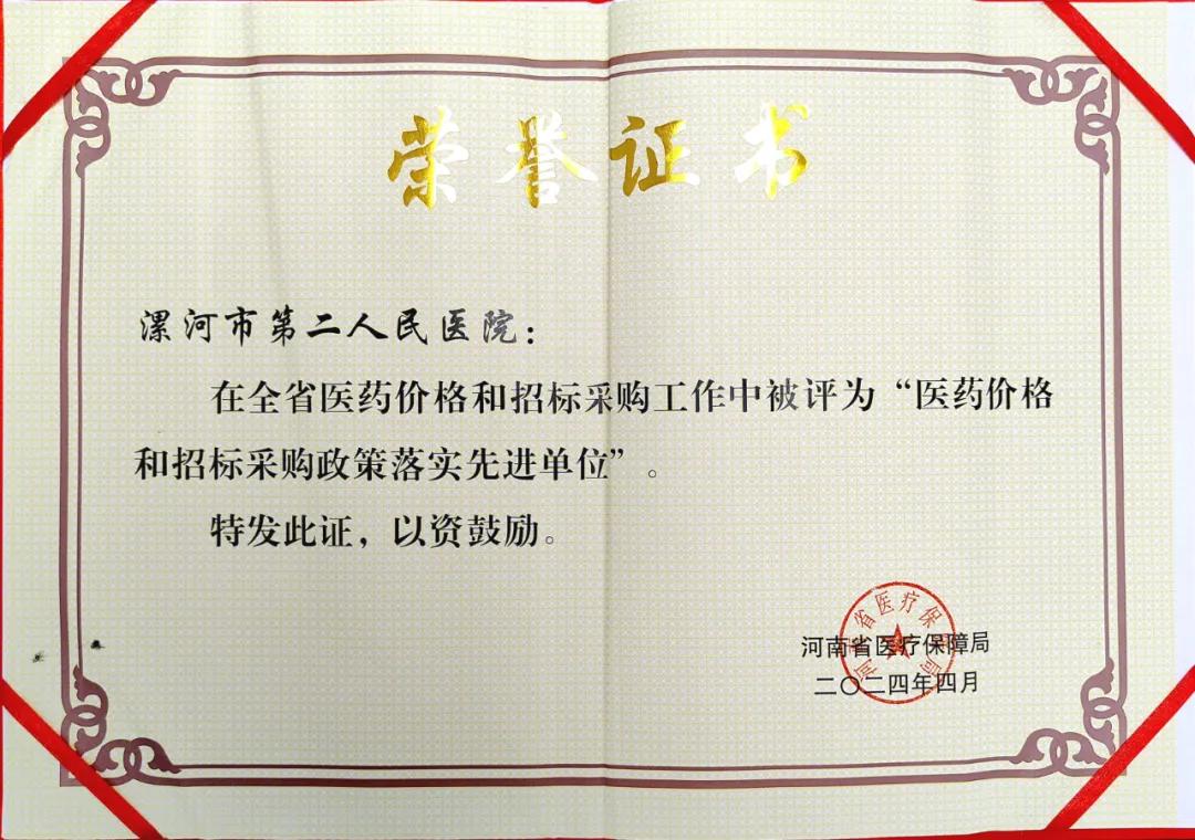 近日,市二院在全省醫(yī)藥價格和招標采購工作綜合評價中,被河南省醫(yī)療保障局評為“醫(yī)藥價格和招標采購政策落實先進單位”。