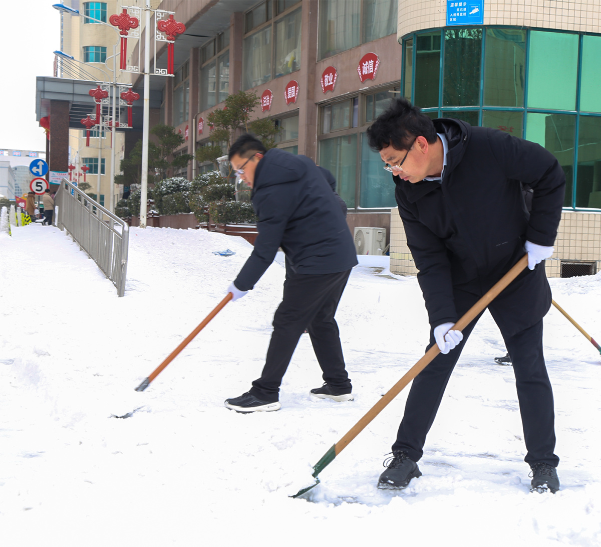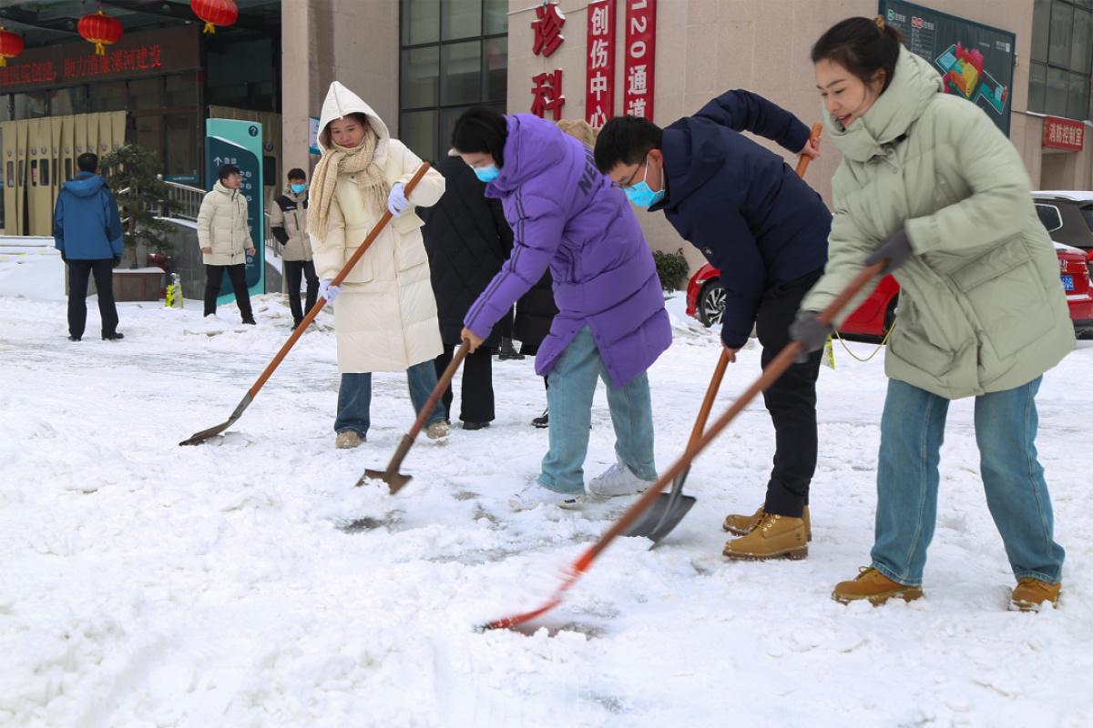 醫(yī)院領(lǐng)導(dǎo)身先士卒,干部職工們干勁十足。大家手持鐵鍬、掃帚等工具,敲冰層、掃積雪,迅速將急診、門(mén)診樓、120通道等重點(diǎn)道路上的積雪和暗冰清除干凈,為生命通道掃清了障礙。