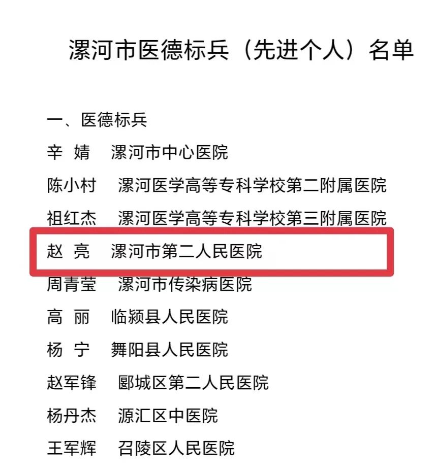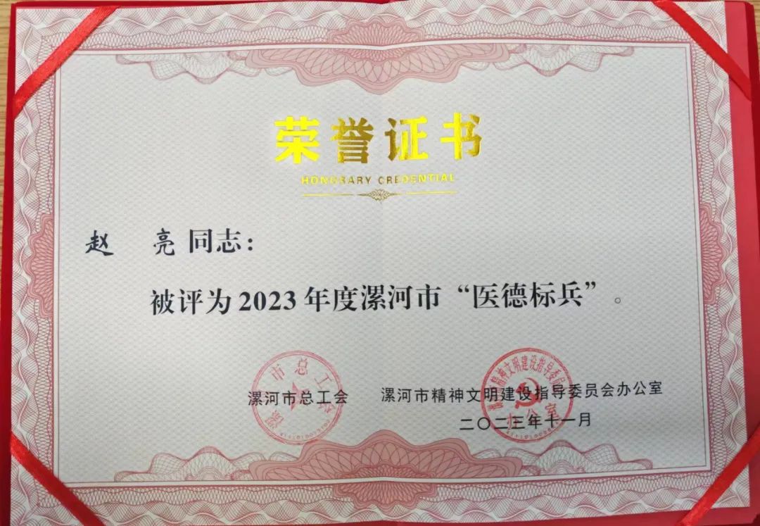 近年來,趙亮先后榮獲“漯河市五一勞動(dòng)獎(jiǎng)?wù)?rdquo;“漯河市職工職業(yè)道德建設(shè)十佳職工”“漯河市青年崗位能手”“漯河市優(yōu)秀醫(yī)師”等榮譽(yù)。一直以來他以白求恩、林巧稚為榜樣,恪守職業(yè)道德,廉潔自律,文明行醫(yī),全心全意為患者提供優(yōu)質(zhì)服務(wù),深受廣大患者尊敬和好評。