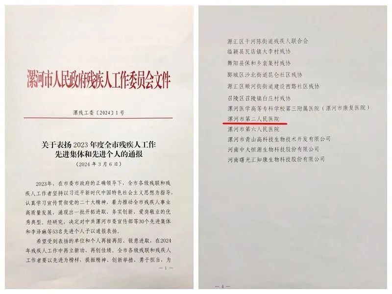 3月6日,漯河市人民政府殘疾人工作委員會發(fā)布《關于表揚2023年度全市殘疾人工作先進集體和先進個人的通報》,市二院榮獲“2023年度全市殘疾人工作先進集體”榮譽稱號。