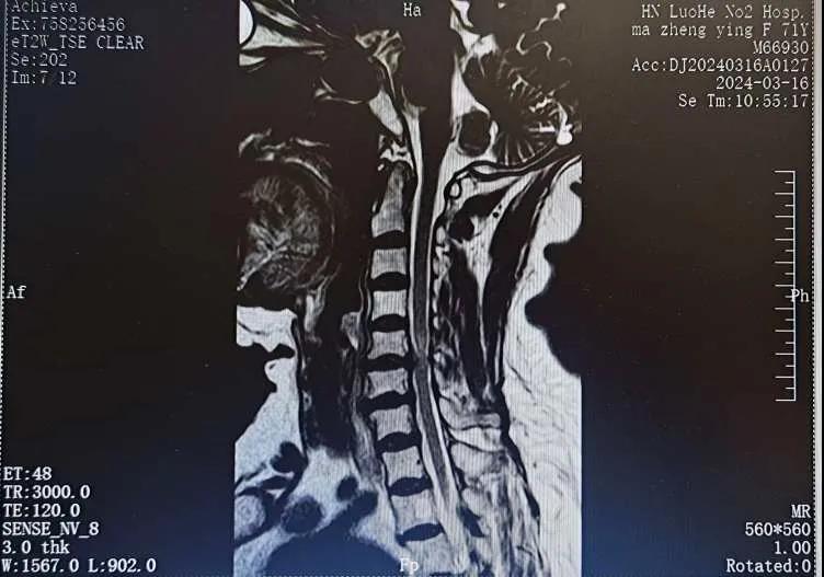 近日,70歲的馬阿姨,因摔傷后出現(xiàn)持續(xù)性頸部疼痛伴右側(cè)肢體無力、麻痛,影響日常生活。于是來到市二院神經(jīng)外科就診,經(jīng)檢查發(fā)現(xiàn):頸椎MR示:頸3/4、4/5、5/6、6/7椎間盤變性突出(中央型)并繼發(fā)性椎管變窄,頸椎退行性改變,頸5椎體水平頸髓水腫。神經(jīng)外科副主任劉沛濤根據(jù)患者癥狀、體征、影像學三者結(jié)合診斷為“脊髓型頸椎病”,考慮到患者癥狀逐漸加重、保守治療效果不佳等情況,建議盡快手術(shù)治療。