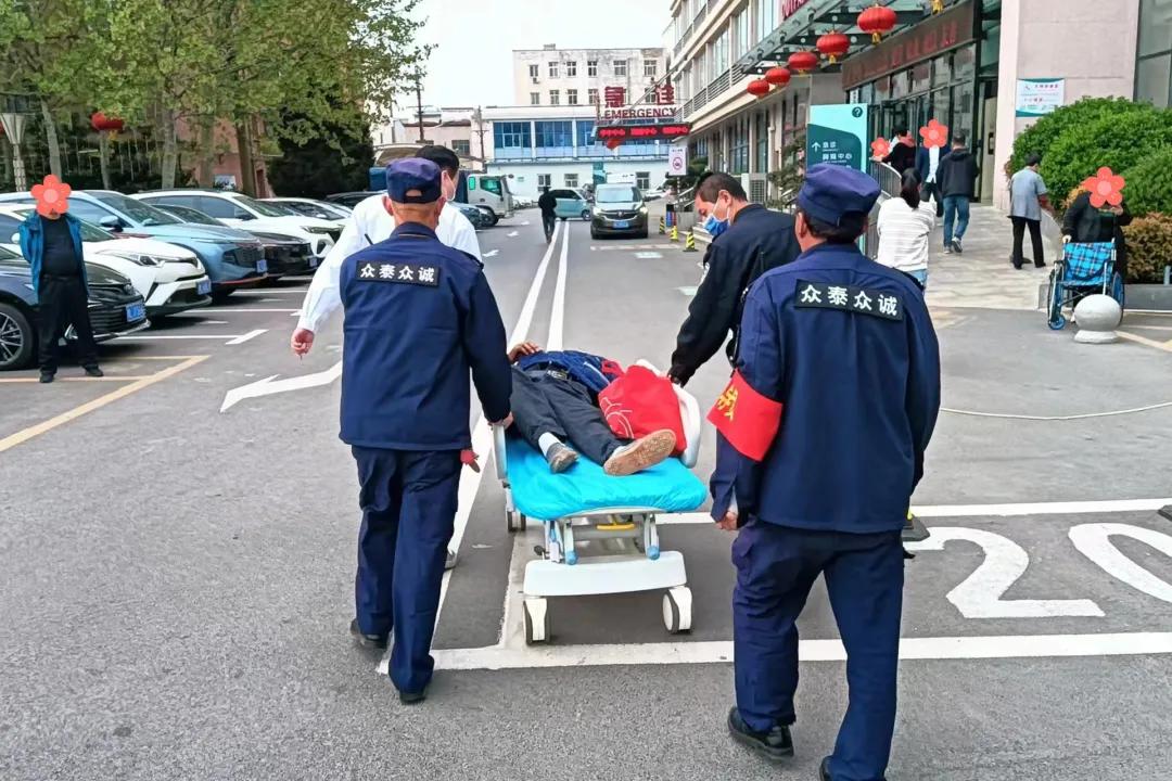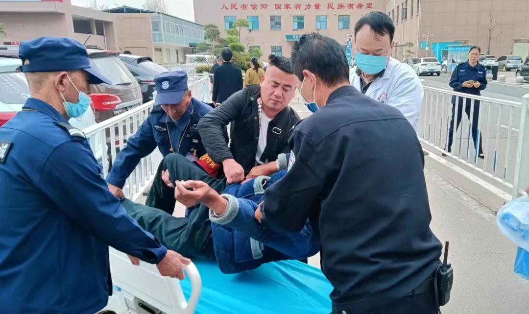 班長王收首先利用醫(yī)院保衛(wèi)科“點(diǎn)對點(diǎn)”的安保設(shè)置,通知急診醫(yī)學(xué)科駐點(diǎn)的安保人員,及時與急診醫(yī)務(wù)人員取得聯(lián)系;同時,安保隊員李文超等人迅速趕到,幫助急診科住院醫(yī)師王英杰一起,將平車推往現(xiàn)場;聞訊趕來的賈俊杰隊長冷靜指揮,多名隊員合力將患者搬上了平車,并迅速轉(zhuǎn)移至急診搶救室。