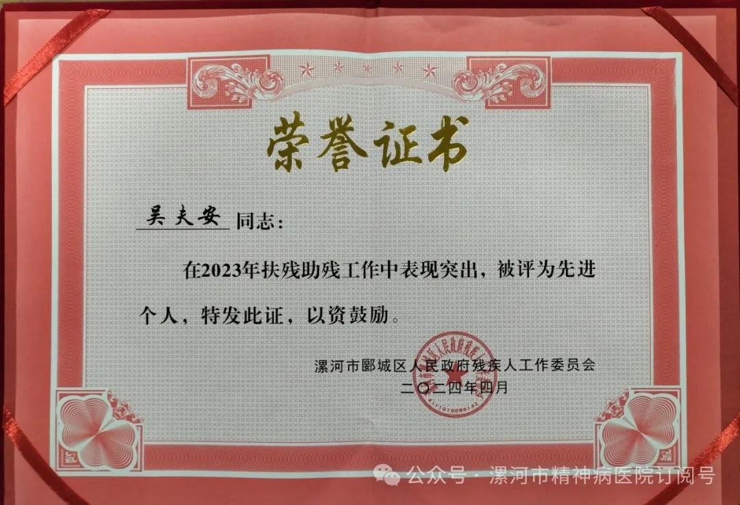 2024年4月24日上午,在漯河市郾城區(qū)殘聯(lián)“關(guān)于表彰2023年度全區(qū)殘疾人工作先進(jìn)集體和先進(jìn)個人”表彰會議中,漯河市精神病醫(yī)院獲得“2023年度扶殘助殘工作先進(jìn)集體”,吳夫安同志在2023年度扶殘助殘工作中表現(xiàn)突出被評為“先進(jìn)個人”榮譽稱號。