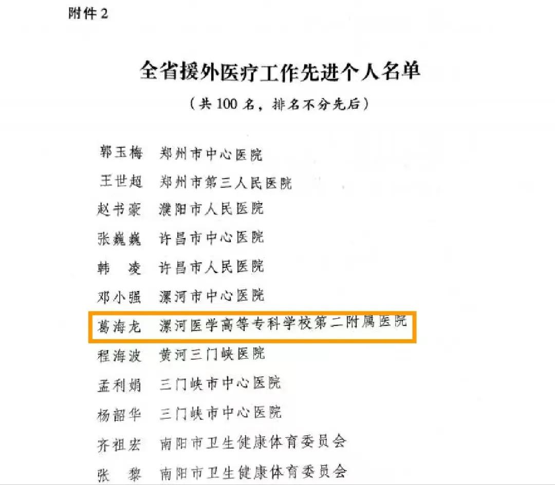 在紀念河南省承派援外醫(yī)療隊50周年的重要時刻,為表揚先進、樹立楷模,省衛(wèi)生健康委隆重舉行紀念大會,對包括援埃塞俄比亞中國醫(yī)療隊群體在內(nèi)的47個優(yōu)秀集體以及100名杰出個人進行了通報表揚。其中,漯河市骨科醫(yī)院(漯河醫(yī)專二附院、漯河市立醫(yī)院)葛海龍榮獲全省援外醫(yī)療工作先進個人!