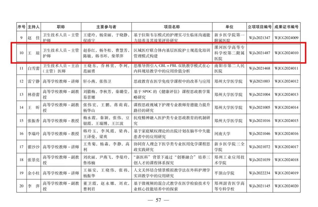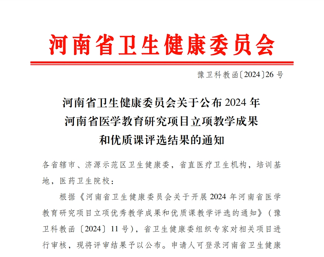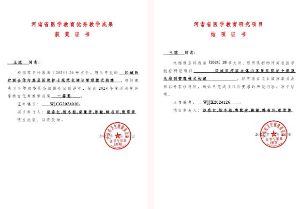 近日,河南省衛(wèi)生健康委員會(huì)下發(fā)了《關(guān)于公布2024年河南省醫(yī)學(xué)教育研究項(xiàng)目立項(xiàng)教學(xué)成果和優(yōu)質(zhì)課評選結(jié)果的通知》,由漯河市骨科醫(yī)院(漯河醫(yī)專二附院、漯河市立醫(yī)院)王瓊、趙春紅、楊冬松、曹慧芳、陳敏、韓書環(huán)、柴翠萍團(tuán)隊(duì)完成的《區(qū)域醫(yī)療聯(lián)合體內(nèi)基層醫(yī)院護(hù)士規(guī)范化培訓(xùn)管理模式構(gòu)建》項(xiàng)目完成結(jié)項(xiàng),被授予2024年河南省醫(yī)學(xué)教育優(yōu)秀教學(xué)成果一等獎(jiǎng)。