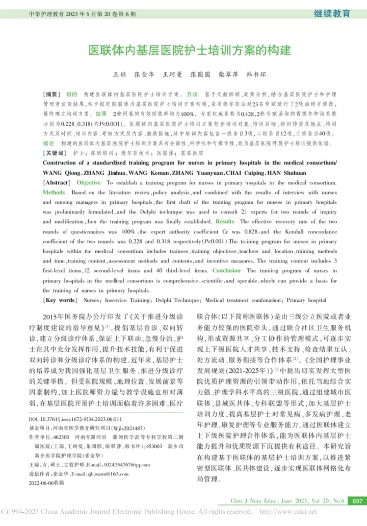 漯河醫(yī)專二附院(漯河市骨科醫(yī)院、漯河市立醫(yī)院)作為國家三級綜合醫(yī)院,高度重視醫(yī)聯(lián)體建設(shè),自2019年成立醫(yī)聯(lián)體組織以來,作為牽頭單位已簽署了30余家成員單位,近年來不斷探索基層醫(yī)院護(hù)士來院培訓(xùn)學(xué)習(xí)方案,2021年我院申報(bào)獲批河南省醫(yī)學(xué)教育研究項(xiàng)目1項(xiàng),項(xiàng)目名稱為“區(qū)域醫(yī)療聯(lián)合體內(nèi)基層醫(yī)院護(hù)士規(guī)范化培訓(xùn)管理模式的構(gòu)建”,項(xiàng)目團(tuán)隊(duì)成員經(jīng)過文獻(xiàn)檢索、調(diào)查研究、專家函詢等形式構(gòu)建了“基于醫(yī)聯(lián)體的基層醫(yī)院護(hù)士培訓(xùn)方案”,該培訓(xùn)方案具有可信性、可行性和可操作性,內(nèi)容全面,有助于提高基層護(hù)士專業(yè)服務(wù)能力的提升,被中文核心期刊中華護(hù)理教育雜志錄用并發(fā)表。