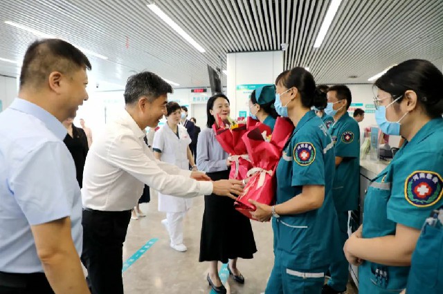 在急診科,宋耀生書記、于宏副主任向急救人員送上鮮花,對他們在急救救援和保障人民生命健康方面所做出的貢獻表示肯定。“急診科是衛(wèi)健系統(tǒng)和醫(yī)院的前沿陣地,你們時刻待命,聞令出擊,為患者救治爭分奪秒,大家辛苦了!”領(lǐng)導的話語溫暖著每一位急診醫(yī)師的心。