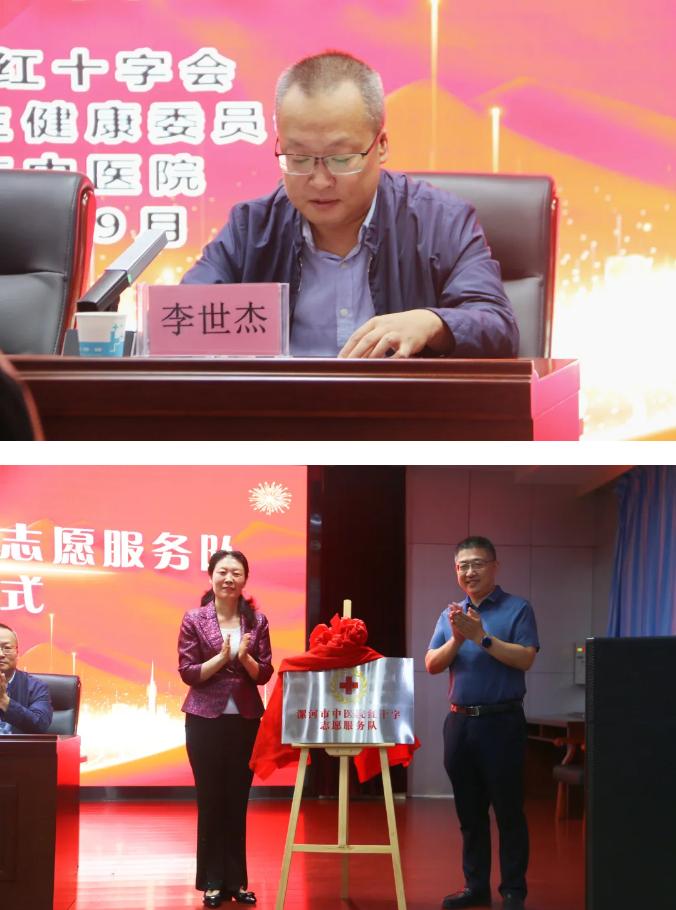李世杰宣讀《漯河市紅十字會關(guān)于同意成立漯河市中醫(yī)院紅十字志愿服務(wù)隊的批復(fù)》文件。孫潁華、王向良為漯河市中醫(yī)院紅十字志愿服務(wù)隊揭牌。孫潁華向漯河市中醫(yī)院紅十字志愿服務(wù)隊授旗。漯河市中醫(yī)院紅十字志愿服務(wù)隊代表李強進行表態(tài)發(fā)言并作出承諾,將充分發(fā)揮紅十字志愿者的優(yōu)勢,為更多需要幫助的人提供醫(yī)療援助和志愿服務(wù)。