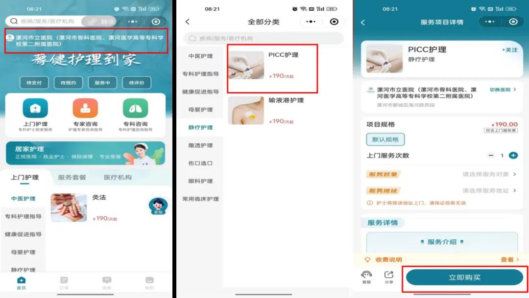 1.微信公眾號搜索“漯河市立醫(yī)院”,進(jìn)入公眾號點擊“微服務(wù)”,選擇“豫健護(hù)理到家”。