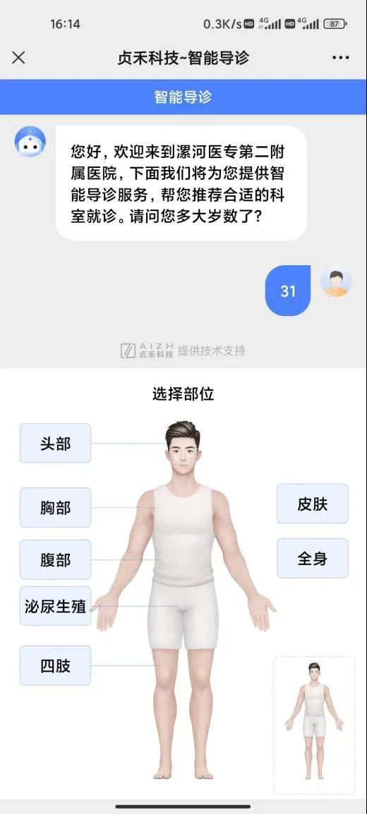 02、點擊就醫(yī)服務(wù),選擇智能導(dǎo)診,進(jìn)入人機(jī)交互界面。