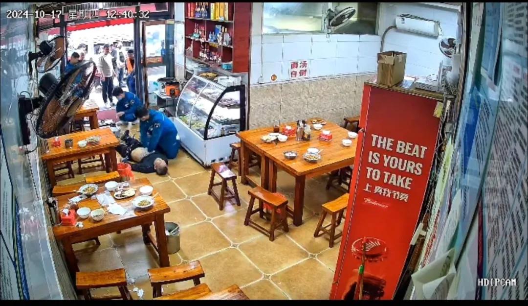 10 月 17 日中午 12 時(shí) 30 分,市二院急診科警報(bào)鈴聲響起,馬路街有一位中年男性就餐時(shí)突然暈倒、昏迷不醒、生命垂危,急需緊急救治。接到出車(chē)命令后,120指揮中心及急診科醫(yī)生王磊與現(xiàn)場(chǎng)人員保持持續(xù)通話,遠(yuǎn)程指導(dǎo),為患者進(jìn)行心肺復(fù)蘇。與此同時(shí),急救人員迅速行動(dòng),僅僅 3 分鐘就趕到了現(xiàn)場(chǎng),快速評(píng)估后發(fā)現(xiàn)患者頸動(dòng)脈搏動(dòng)消失,無(wú)自主呼吸。