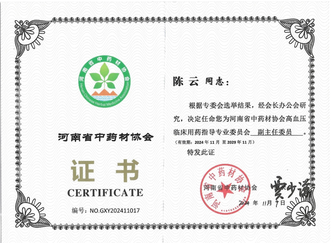 陳云表示,此次當(dāng)選河南省中藥材協(xié)會(huì)高血壓臨床用藥指導(dǎo)專業(yè)委員會(huì)副主任委員,是對(duì)漯河市中醫(yī)院在高血壓疾病診治、高血壓??平ㄔO(shè)及學(xué)術(shù)水平等方面的肯定,同時(shí)更是一種責(zé)任和使命。接下來(lái),科室團(tuán)隊(duì)會(huì)更加精研技術(shù),探索藥技融合、中西醫(yī)結(jié)合運(yùn)用多元化手段精準(zhǔn)診治高血壓疾病,造福更多的高血壓人群。