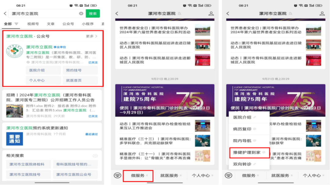 1.微信公眾號搜索“漯河市立醫(yī)院”,進(jìn)入公眾號點(diǎn)擊“微服務(wù)”,選擇“豫健護(hù)理到家”。