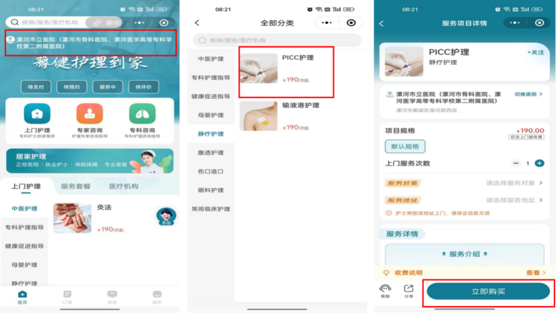 2.進(jìn)入后查看醫(yī)院是否正確,以下內(nèi)容以PICC護(hù)理為例:選擇PICC護(hù)理,點(diǎn)擊立即購買。