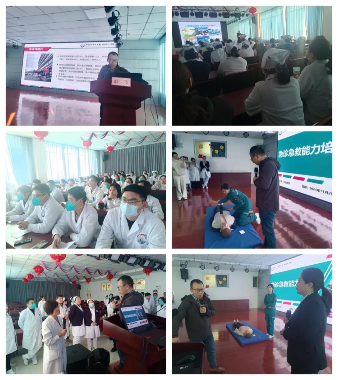培訓中,彭飛醫(yī)生以《急診急救能力培訓》為題,為參會人員講解了急診急救知識,并著重強調了在危重病人搶救時,醫(yī)護人員相互配合及團隊協(xié)作的重要性。隨后針對“初級心肺復蘇技能”這一急診急救技術的要點、難點、重點進行了趣味性解讀,護士萬鑫茹借助人體模型進行心肺復蘇模擬操作,現(xiàn)場學習氛圍濃厚,醫(yī)護人員積極參與練習互動。