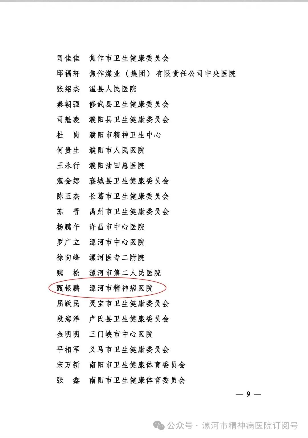 近日河南省健康委員會關(guān)于表揚2024年度全省醫(yī)政和護(hù)理工作表現(xiàn)突出集體和個人的通報中,漯河市精神病醫(yī)院醫(yī)務(wù)科科長甄銀鵬榮獲“全省醫(yī)政工作表現(xiàn)突出個人”