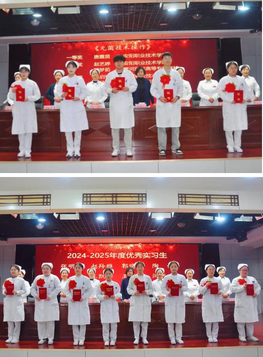 外一科護(hù)士長(zhǎng)郭書娟、血液腫瘤科護(hù)士長(zhǎng)袁菲分別宣讀了關(guān)于表彰技能操作競(jìng)賽獲獎(jiǎng)人員和優(yōu)秀實(shí)習(xí)生名單。隨后,對(duì)陶媛等12名護(hù)理實(shí)習(xí)生技能操作競(jìng)賽獲獎(jiǎng)人員及在2024-2025年度護(hù)理實(shí)習(xí)工作中涌現(xiàn)出的張明怡等8名優(yōu)秀實(shí)習(xí)生頒發(fā)了榮譽(yù)證書。