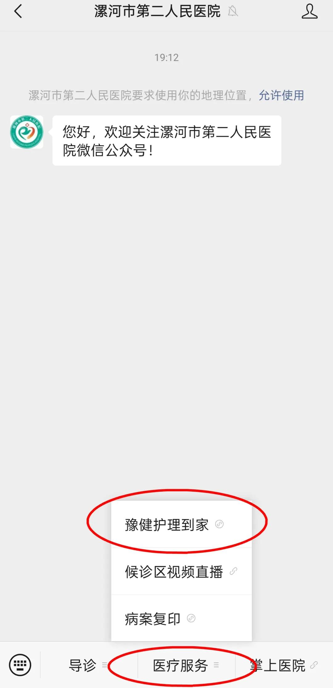 方法一:微信搜索“漯河市第二人民醫(yī)院”公眾號進入主頁面,關注服務號之后,點擊醫(yī)療服務→豫健護理到家項目。