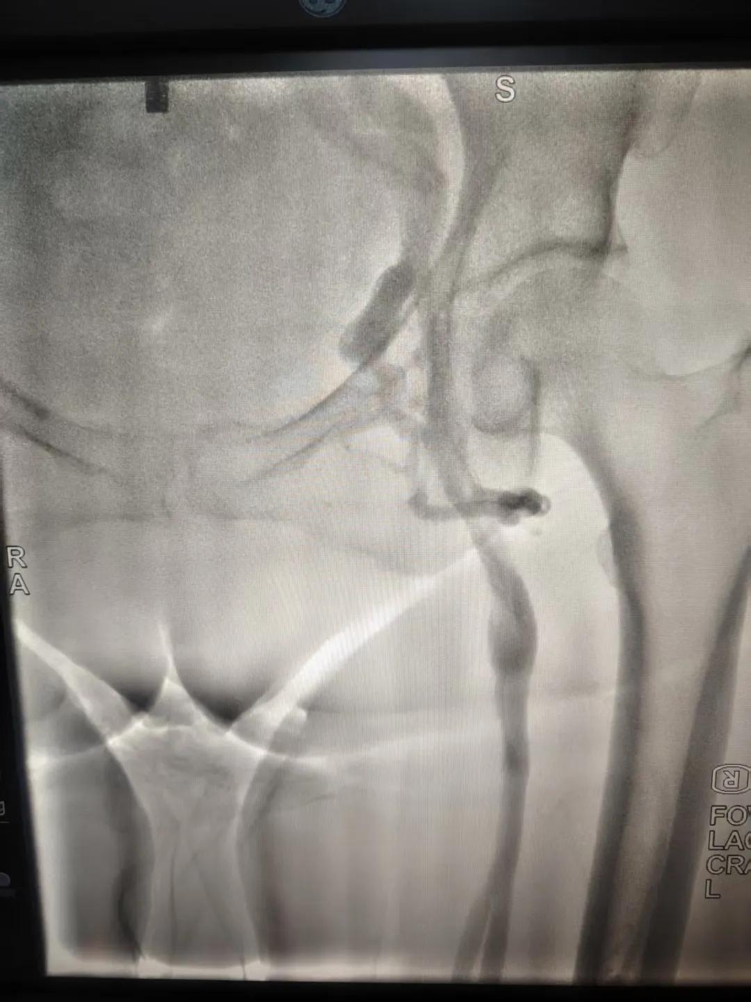 該患者,中年女性,左下肢反復(fù)腫脹、疼痛多年就醫(yī),未明病因。門(mén)診就診,經(jīng)血管外科副主任周創(chuàng)業(yè)評(píng)估病情后,為該患者門(mén)診行下肢靜脈造影,造影結(jié)果示:左髂靜脈周?chē)鷤?cè)枝形成,左髂靜脈壓迫綜合癥。明確診斷后將擇期介入手術(shù)治療。