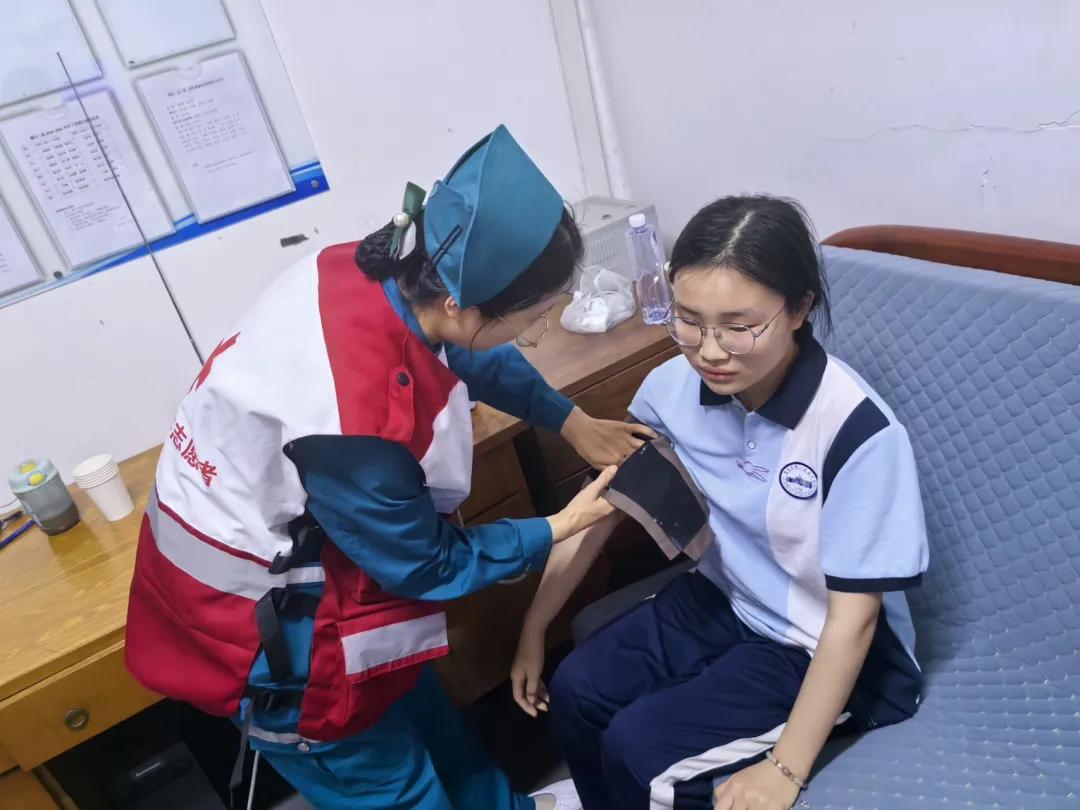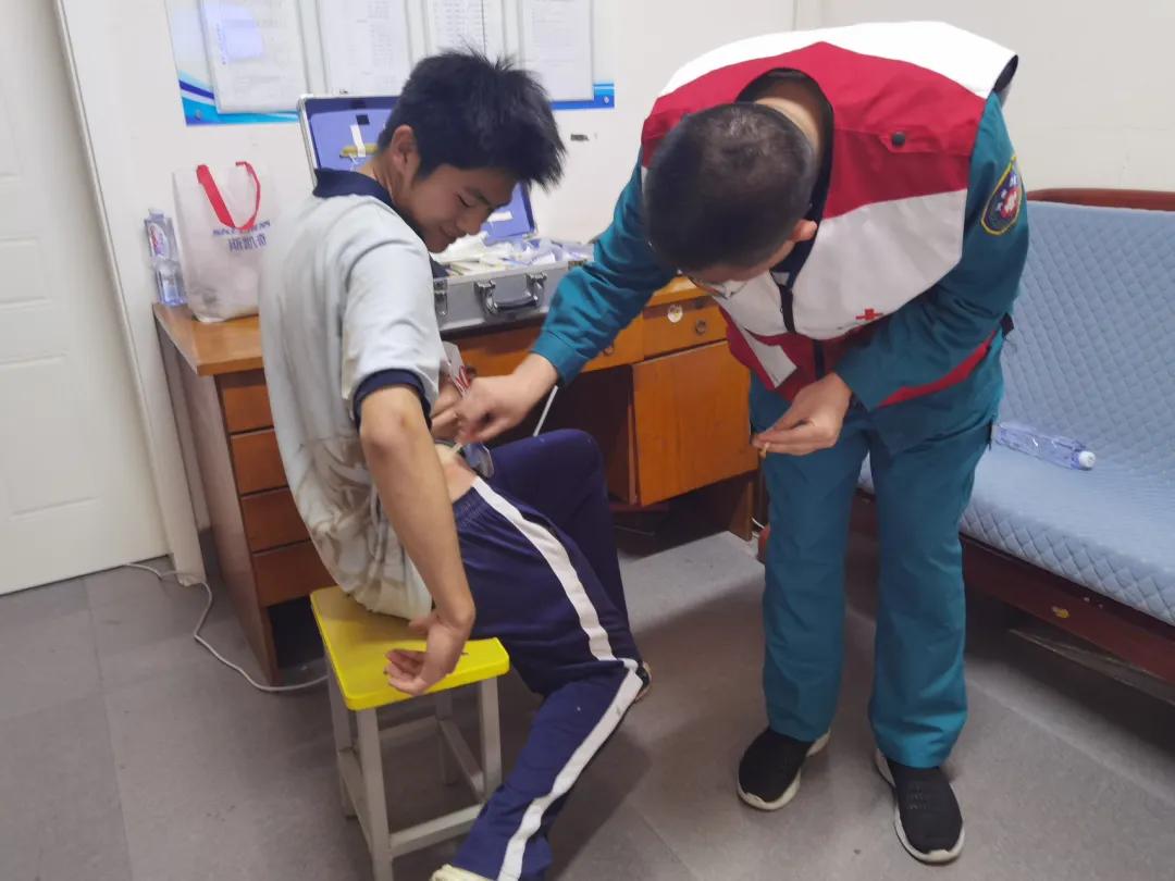 運動會期間,志愿者穿梭于賽場的各個角落,化身“移動急救站”,時刻關(guān)注著運動員的狀態(tài)。一旦接到求助,他們迅速到達現(xiàn)場,對傷員進行初步診斷和處理,為擦傷運動員細心消毒包扎,為身體不適學(xué)生及時測量血壓、補充電解質(zhì)飲品。面對突發(fā)扭傷學(xué)生,志愿者第一時間進行專業(yè)評估與固定處理,贏得師生一致好評。