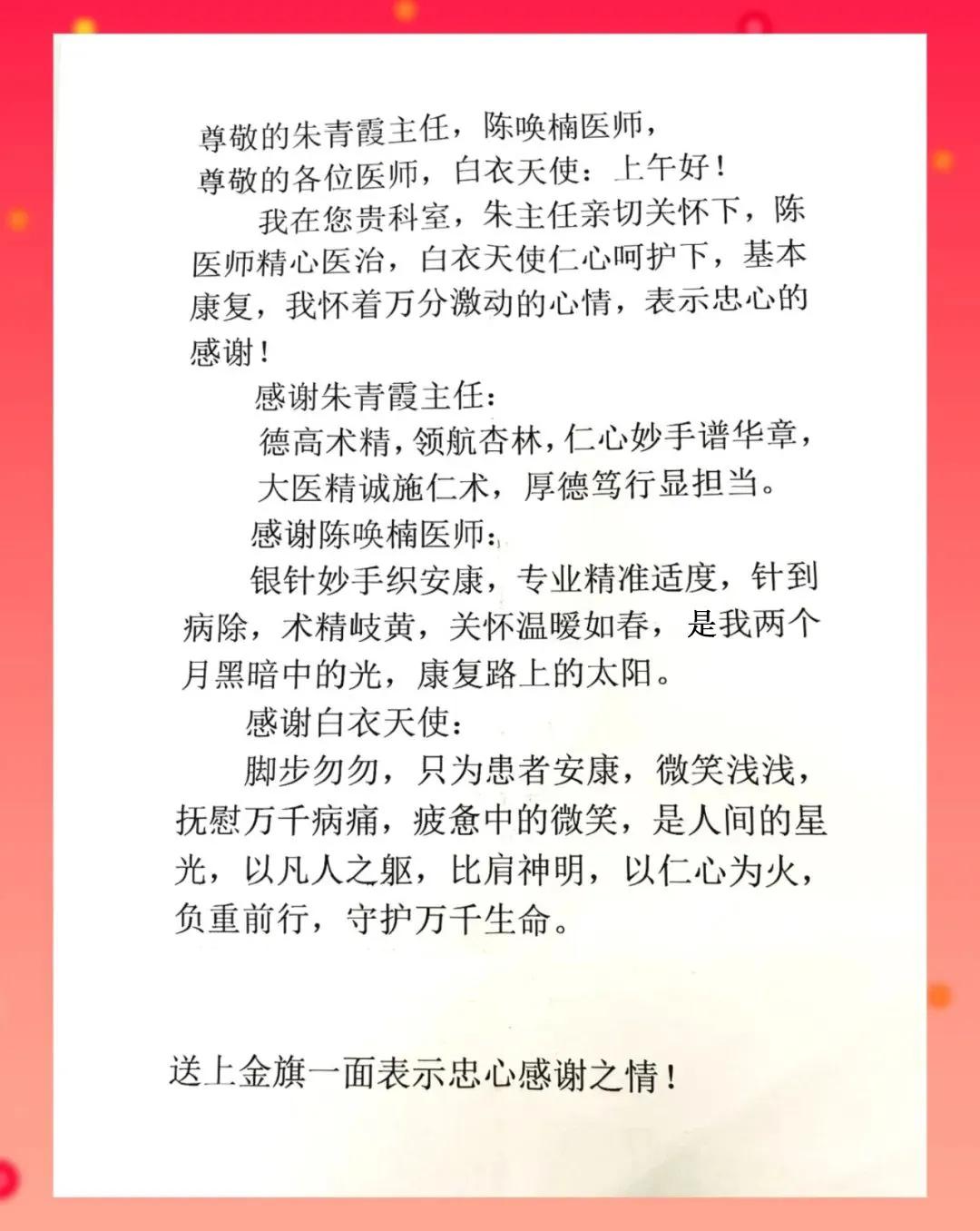 近日,市二院中醫(yī)針灸科門診醫(yī)護(hù)人員一如既往地忙碌著。突然,走廊里傳來一陣熱烈的掌聲,原來,74歲的田大叔在家人陪伴下,手捧錦旗和感謝信來到醫(yī)院。田大叔激動(dòng)地展開感謝信,聲情并茂地朗讀起來,說到動(dòng)情處更是眼含熱淚,字里行間飽含著對(duì)中醫(yī)針灸科主任朱青霞的誠摯謝意和對(duì)整個(gè)醫(yī)護(hù)團(tuán)隊(duì)精湛醫(yī)術(shù)與暖心服務(wù)的認(rèn)可與贊美。讀完,田大叔深深地鞠躬致謝,這一躬身,更是見證中醫(yī)針灸科‘破冰’三十年病痛,醫(yī)患同心最好的詮釋。