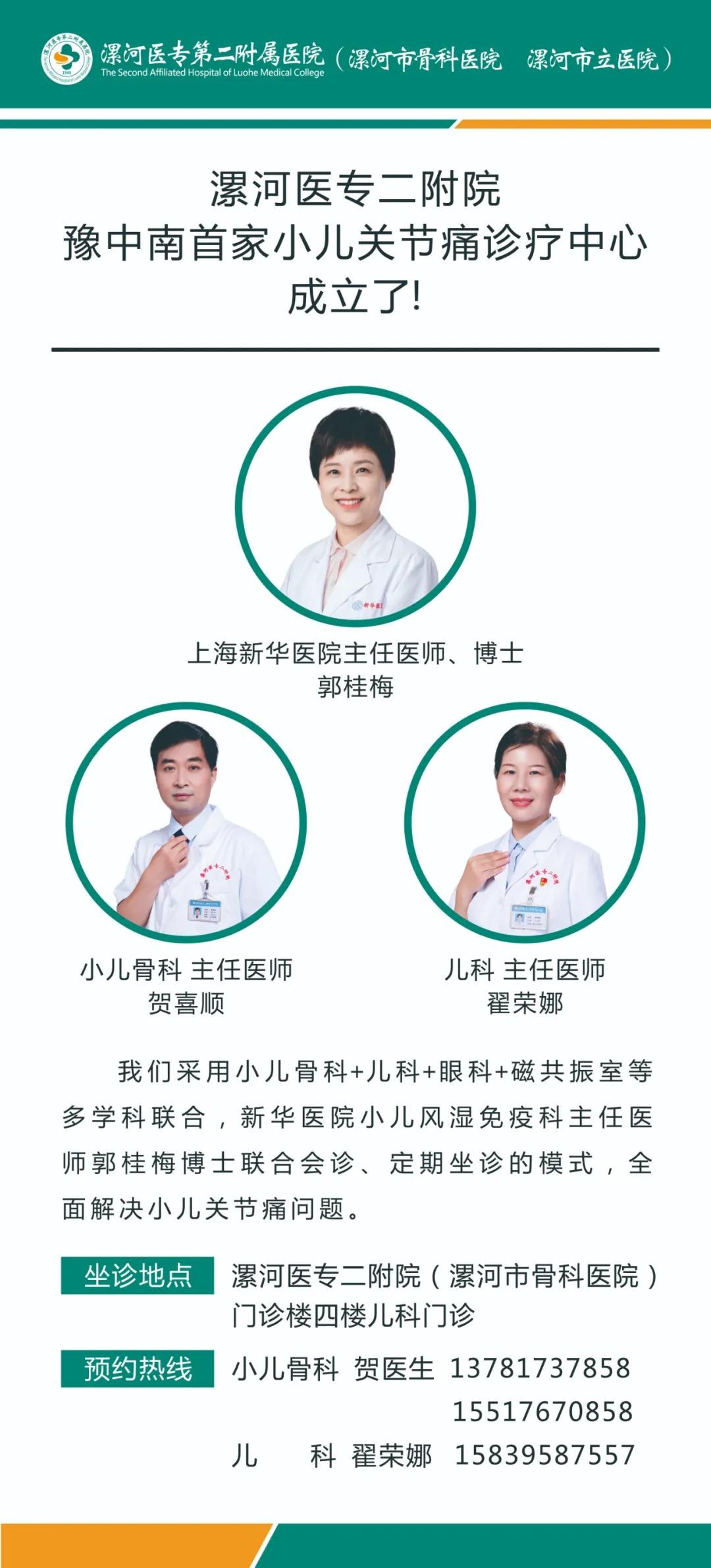 小兒關(guān)節(jié)痛診斷和治療的關(guān)鍵是通過專業(yè)診斷來區(qū)分不同的病因,為此,漯河醫(yī)專二附院(漯河市骨科醫(yī)院,漯河市立醫(yī)院)成立了豫中南地區(qū)首家“小兒關(guān)節(jié)痛多學(xué)科診療中心”!