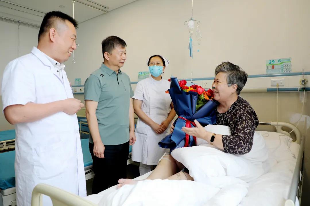 5月30日上午,市二院黨委書記魏松、副院長劉橋?qū)3虂淼讲》?,看望慰問這位康復中的香港同胞,送上代表健康祝愿的鮮花,關(guān)切詢問其身體恢復情況,并送上端午安康的祝福。“沒想到在異鄉(xiāng)生病,還能在節(jié)日收到這么溫暖的關(guān)懷,真的太感謝大家了!是二院優(yōu)秀的醫(yī)護團隊救了我的命,我們?nèi)叶几屑げ槐M!感謝二院!感謝漯河!”翁阿姨激動地表示,醫(yī)院高效的救治與貼心的服務,讓他感受到了重生的喜悅和家一般的溫暖。