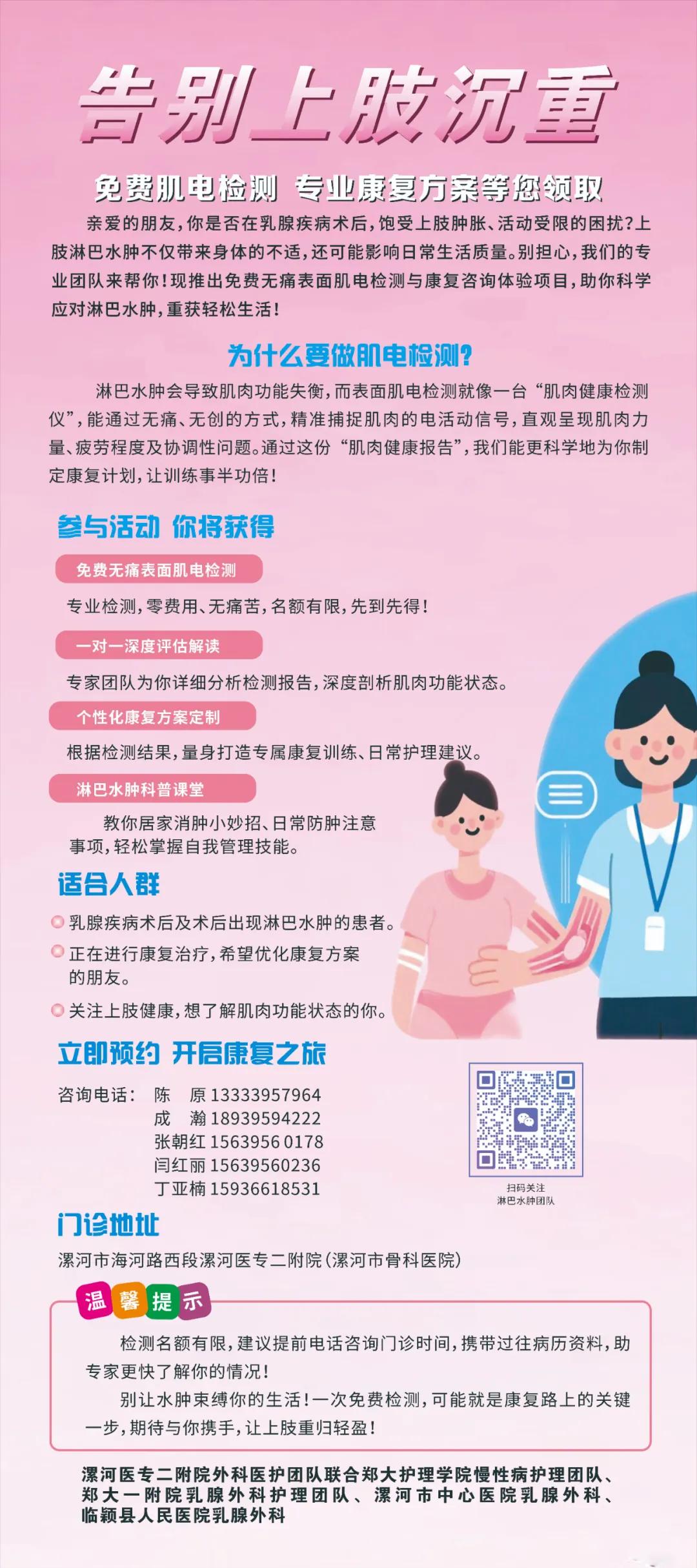 漯河醫(yī)專二附院聯(lián)合省市級多專家團隊推出公益項目,于6月20日開放免費無痛檢測名額,含一對一報告解讀與康復指導,助您科學應對水腫困擾。立即致電咨詢預約,讓專業(yè)團隊為您的上肢健康保駕護航!