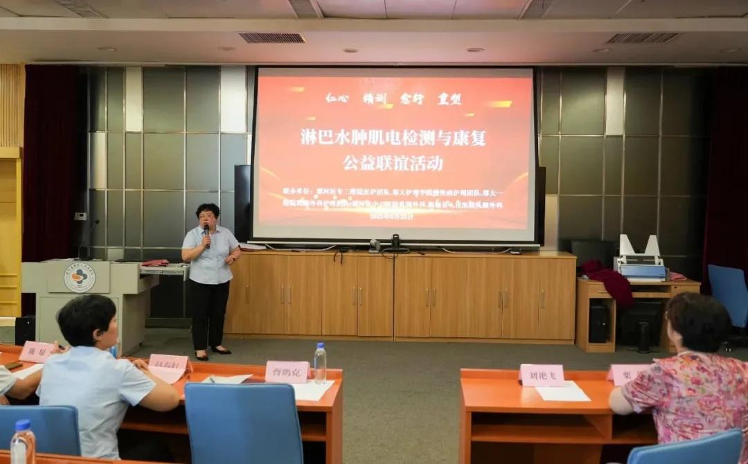 為了幫助乳腺疾病術(shù)后及術(shù)后出現(xiàn)淋巴水腫患者提高防治意識,漯河醫(yī)專二附院淋巴水腫MDT團(tuán)隊,由護(hù)理部趙春紅主任倡導(dǎo),傷口造口治療室負(fù)責(zé)人成瀚牽頭,康復(fù)科負(fù)責(zé)人張靜及護(hù)士長田智慧,康復(fù)科肌電圖室張朝紅主任團(tuán)隊,急診外科張曉光主任淋巴水腫手術(shù)團(tuán)隊,外一科陳原主任及外三科護(hù)士長丁亞楠團(tuán)隊,漯河醫(yī)專二附院取得國家級證書的所有人員共同參與本次活動。