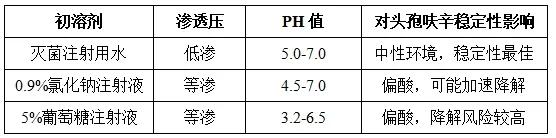 溶媒的pH是影響藥物溶解的關鍵因素。頭孢呋辛鈉是β-內(nèi)酰胺類抗生素,pH為6.0-8.0。此類藥物易受H+或OH-的催化而降解,因此頭孢呋辛鈉在水溶液中的降解速率與溶液pH值有關。頭孢呋辛鈉在中性環(huán)境(pH 6.0-8.0)最穩(wěn)定。滅菌注射用水的pH(5.0-7.0)接近中性,而生理鹽水pH(4.5-7.0)和葡萄糖注射液pH(3.2-6.5)可能偏酸,加速藥物水解,生成黃色降解產(chǎn)物(如7位側鏈衍生物),降低藥效。