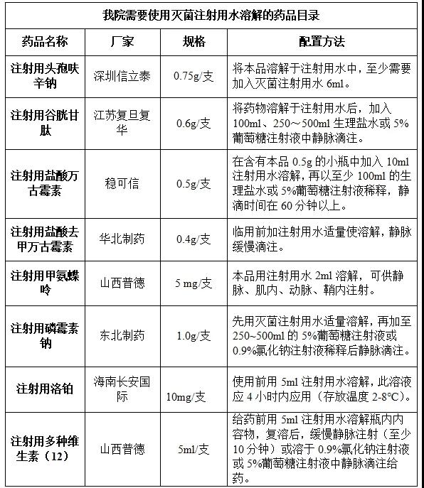 現(xiàn)對我院常用需使用滅菌注射用水初溶的藥品及配置細節(jié)整理如下: