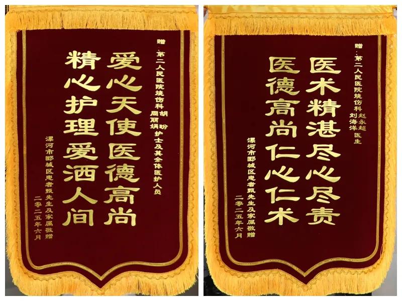 住院的日子里,每一天都讓患者感受到溫暖,每一名醫(yī)生,每一名護士,都讓他難忘。在出院時,患者及家屬激動不已:“沒想到我會恢復這么快,感謝你們的精湛醫(yī)術,是你們給了我第二次生命!”為表示感謝,患者特地囑托身在外地的兒子定制了兩面錦旗,送至科室醫(yī)護手中。