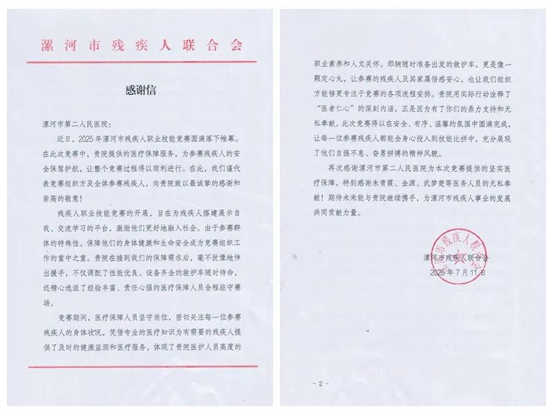 近日,市二院收到一封來(lái)自市殘聯(lián)發(fā)來(lái)的感謝信。信中高度贊譽(yù)醫(yī)院在2025年全市殘疾人職業(yè)技能競(jìng)賽期間提供的全方位醫(yī)療保障服務(wù),稱(chēng)其“用實(shí)際行動(dòng)詮釋醫(yī)者仁心,為賽事筑起堅(jiān)實(shí)的安全防線。”