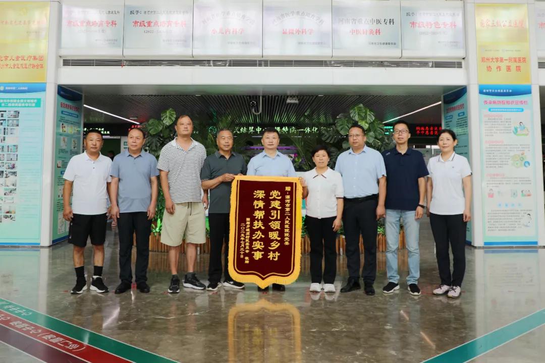 7月30日上午,臨潁縣固廂鄉(xiāng)城頂村黨支部書記楊勝武帶領(lǐng)村“兩委”干部,代表全體村民專程來(lái)到市二院,將一面飽含深情的錦旗送到院黨委書記魏松,黨委副書記、院長(zhǎng)胡海英手中,以此感謝市二院及派駐第一書記在駐村幫扶中給予的堅(jiān)定支持和為村里帶來(lái)的實(shí)際變化。