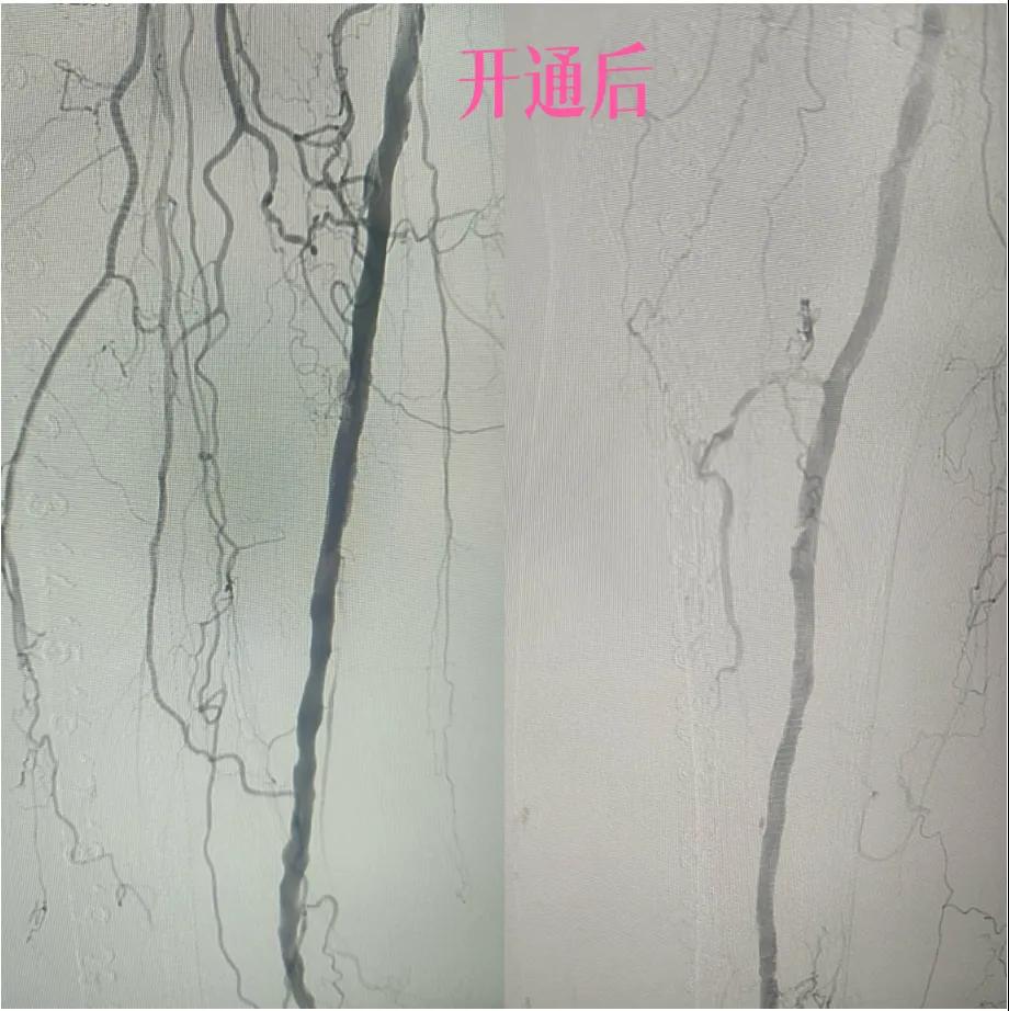4. 即刻“見(jiàn)證”:再次造影顯示,原本狹窄閉塞的血管段血流恢復(fù)通暢!足部遠(yuǎn)端血管顯影較前明顯改善。手術(shù)過(guò)程順利,患者靜息痛較前明顯改善。