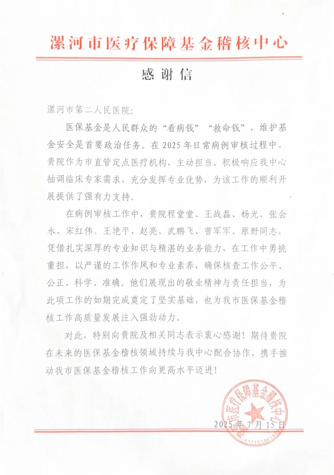 近日,市醫(yī)療保障基金稽核中心向市二院發(fā)來感謝信,對醫(yī)院選派多名業(yè)務骨干協(xié)助開展2025年日常病例審核工作表示感謝,信中高度評價市二院專家團隊以扎實的臨床功底和嚴謹?shù)墓ぷ髯黠L,高效完成病例合規(guī)性審查,為醫(yī)?;鸨O(jiān)管提供重要技術(shù)支持,并對醫(yī)院長期以來在醫(yī)保政策落實、醫(yī)療質(zhì)量管控方面的工作成效給予充分肯定。