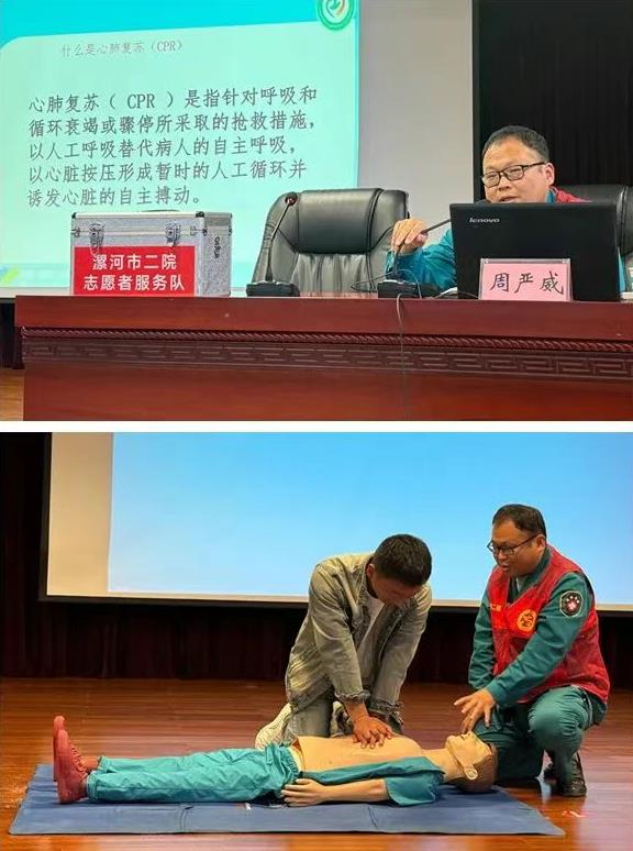 隨后,急診科副主任醫(yī)師周嚴(yán)威圍繞《應(yīng)急急救技能實操》進(jìn)行專題講解與現(xiàn)場演示,重點(diǎn)聚焦海姆立克急救法與心肺復(fù)蘇術(shù)兩大關(guān)鍵技能。為讓職工更直觀掌握動作要領(lǐng),周嚴(yán)威副主任醫(yī)師使用人體模型進(jìn)行多輪演示,同時邀請現(xiàn)場職工上臺實操練習(xí),確保每位參與實操的職工都能規(guī)范掌握核心步驟。
