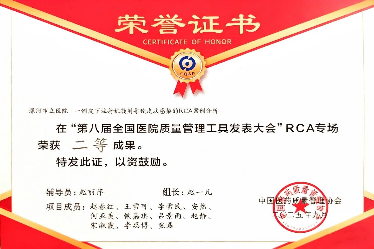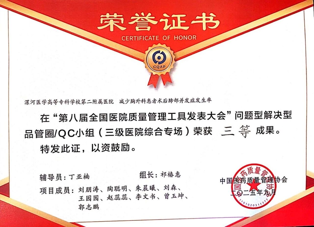 近日,第八屆醫(yī)院質(zhì)量管理工具應(yīng)用成果發(fā)表大會在重慶落幕。此次大賽共有來自全國的600多項課題參賽,其中413個項目入圍決賽,競爭激烈。 漯河醫(yī)專二附院(漯河市骨科醫(yī)院、漯河市立醫(yī)院)關(guān)節(jié)外科選送的RCA項目與胸外科選送的"非常好圈"品管圈項目,在各自專場中展現(xiàn)了扎實的專業(yè)素養(yǎng),最終在眾多優(yōu)秀團隊中勝出,分別斬獲二等獎和三等獎。