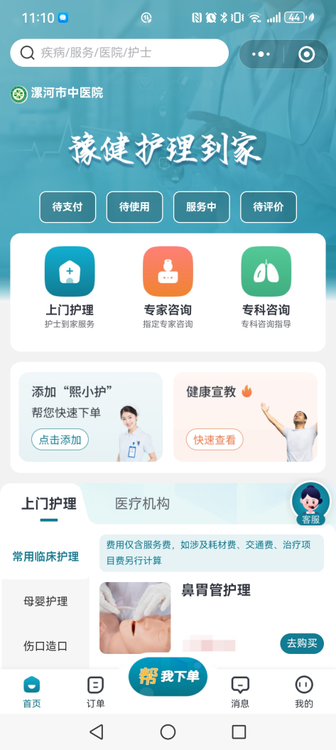 目前,漯河市中醫(yī)院居家護(hù)理上線項目包含鼻胃管護(hù)理、導(dǎo)尿管護(hù)理、肌肉注射、皮下注射等常用臨床護(hù)理,新生兒測黃疸、新生兒臀部護(hù)理、產(chǎn)后會陰傷口護(hù)理、產(chǎn)后乳房護(hù)理等母嬰護(hù)理,特殊造口護(hù)理、疑難造口護(hù)理、失禁性皮炎護(hù)理等傷口造口護(hù)理,PICC護(hù)理、輸液港護(hù)理,灸法、中藥涂藥、刮痧、耳穴貼壓等中醫(yī)護(hù)理共7大類51項。居民通過手機端足不出戶即可在線預(yù)約居家護(hù)理服務(wù),執(zhí)業(yè)護(hù)士“一鍵接單”,提供專業(yè)的上門居家護(hù)理服務(wù),免去人民群眾奔波醫(yī)院之苦,讓優(yōu)質(zhì)護(hù)理服務(wù)觸手可及。
