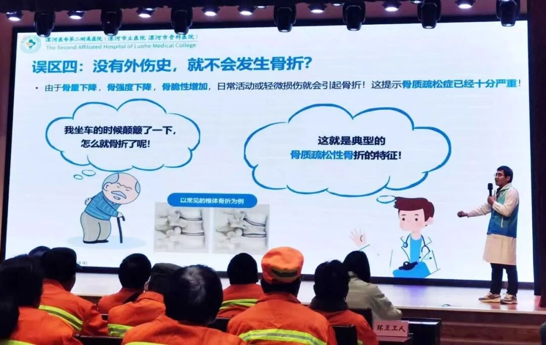 活動中,漯河醫(yī)專二附院骨科專家王松茂聚焦10月20日“世界骨質(zhì)疏松日”主題,針對基層群眾尤其是環(huán)衛(wèi)工人的工作特點,開展骨質(zhì)疏松專題健康科普講座。講座內(nèi)容貼合群眾需求,從骨質(zhì)疏松的成因、早期癥狀、預(yù)防方法到日常養(yǎng)護(hù)要點,進(jìn)行了通俗細(xì)致的講解,幫助群眾建立科學(xué)的骨骼健康認(rèn)知,為預(yù)防骨質(zhì)疏松奠定基礎(chǔ)。