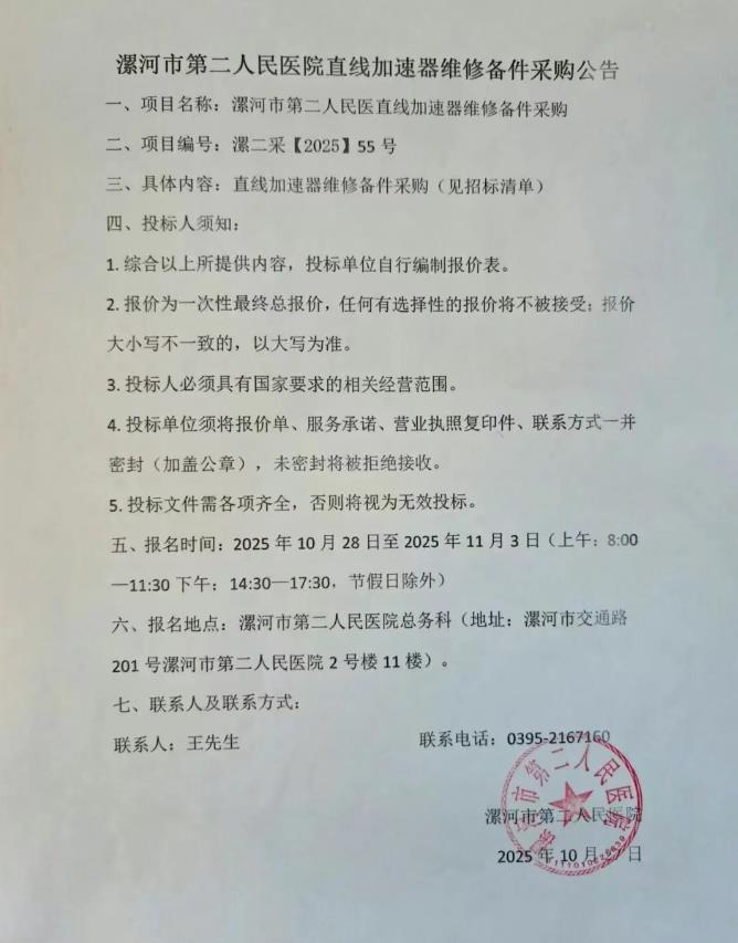 漯河市第二人民醫(yī)院直線(xiàn)加速器維修備件采購(gòu)公告