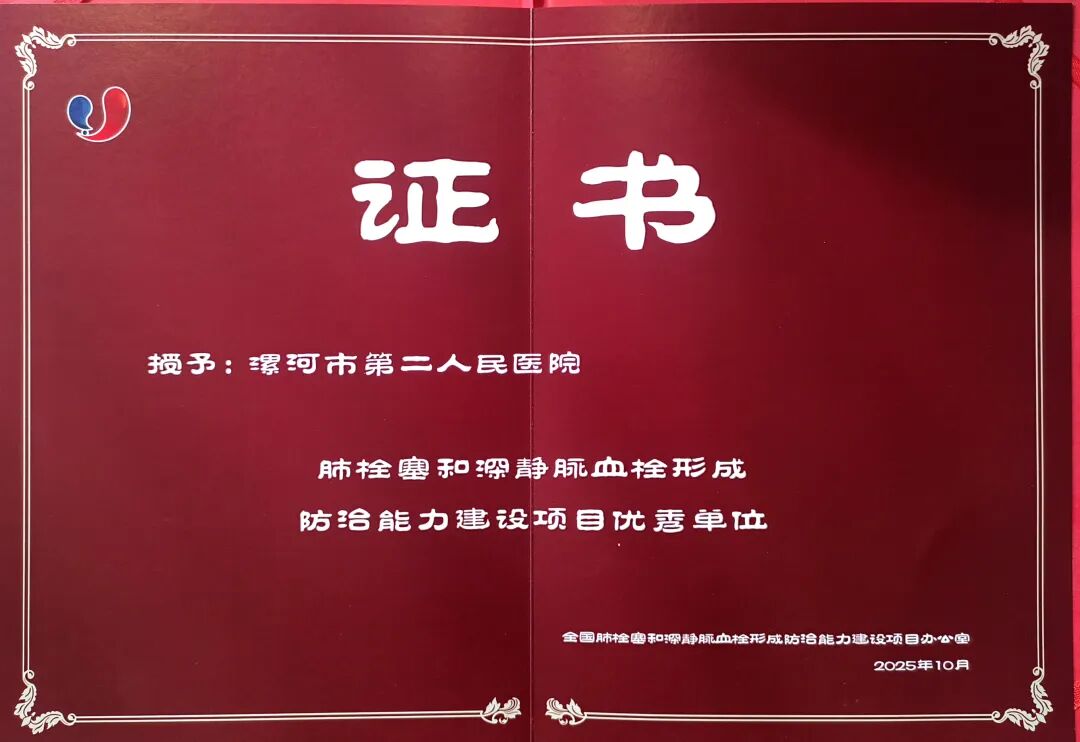 漯河市二院獲評(píng)“全國(guó)肺栓塞和深靜脈血栓形成防治能力建設(shè)項(xiàng)目?jī)?yōu)秀單位”