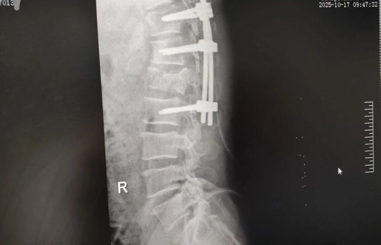 針對腰椎傷情,骨科竇志剛醫(yī)生團隊緊急開展腰 1 椎體爆裂性骨折切開復位內固定術 + 椎板切除減壓術。手術室、麻醉科無縫銜接開通綠色通道,手術團隊快速就位,術后患者下肢活動恢復自如。