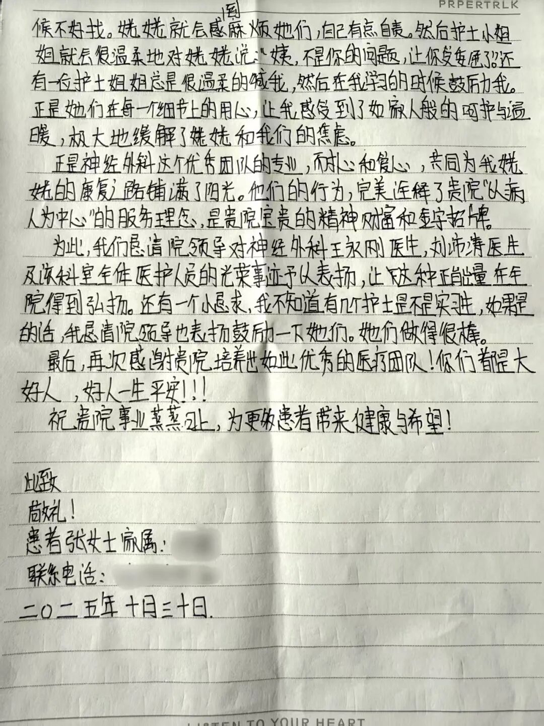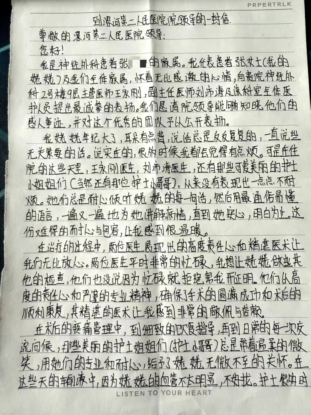 據(jù)了解,張女士的姥姥因“背部腫物”一直備受困擾,6年前在其他醫(yī)院手術(shù)治療后效果不佳,1年內(nèi)復(fù)發(fā),腫物逐漸增大,并出現(xiàn)肩部活動受限伴肩部疼痛。來到市二院后神經(jīng)外科醫(yī)生立即進(jìn)行手術(shù),因術(shù)中腫物與周圍組織粘連嚴(yán)重,手術(shù)歷時近2個小時,術(shù)后恢復(fù)良好。“我的姥姥年紀(jì)大了,耳朵有點(diǎn)背,說話總是反反復(fù)復(fù),啰啰嗦嗦的。說實(shí)在的,有時候我都會覺得有點(diǎn)煩。可是從住院以來,劉沛濤主任、王永剛醫(yī)生,還有那些美麗可愛的護(hù)士小姐姐們和帥氣的護(hù)士小哥哥,從來沒有表現(xiàn)出一點(diǎn)點(diǎn)不耐煩。他們總是耐心地聽姥姥講,一遍遍地解釋給她聽,直到她聽懂為止。”張女士的表揚(yáng)信中字里行間包含著對神經(jīng)外科整個醫(yī)護(hù)團(tuán)隊(duì)暖心服務(wù)的認(rèn)可與贊美。
