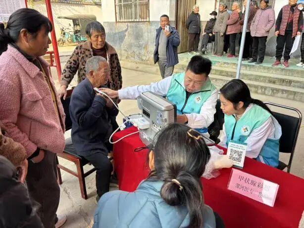 活動現(xiàn)場,漯河醫(yī)專二附院各科醫(yī)療專家志愿者熟練操作便攜式診療設(shè)備,有序的為當(dāng)?shù)卮迕衩赓M測量血壓、手指血糖、甲狀腺彩超、骨密度檢測、眼底篩查、體格檢查、用藥指導(dǎo)、健康咨詢、疾病診斷等。面對前來就診的群眾,專家們耐心傾聽村民的病情描述,細(xì)致詢問既往病史、用藥情況,結(jié)合專業(yè)檢查給出精準(zhǔn)診斷,同時圍繞常見慢性病管理、冬季傳染病預(yù)防、合理用藥等知識,發(fā)放宣傳手冊,用通俗易懂的語言為村民答疑解惑。
