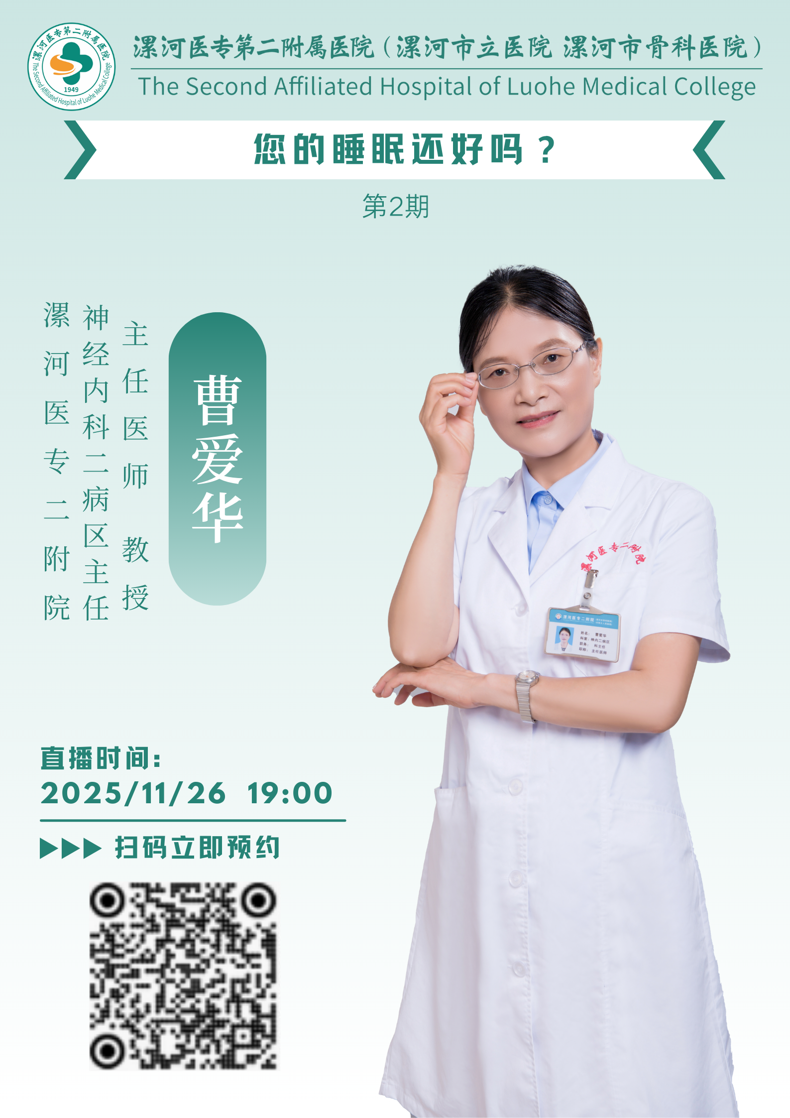 直播預(yù)告|漯河醫(yī)專二附院健康科普“云直播”第二期 您的睡眠還好嗎? “您的睡眠還好嗎?”11月26日(周三)晚7點(diǎn),漯河醫(yī)專二附院(漯河市骨科醫(yī)院、漯河市立醫(yī)院)健康科普“云直播”,邀請(qǐng)漯河市睡眠醫(yī)學(xué)中心負(fù)責(zé)人、漯河醫(yī)專二附院神經(jīng)內(nèi)科二病區(qū)主任曹愛華教授與您共話健康睡眠,敬請(qǐng)關(guān)注!