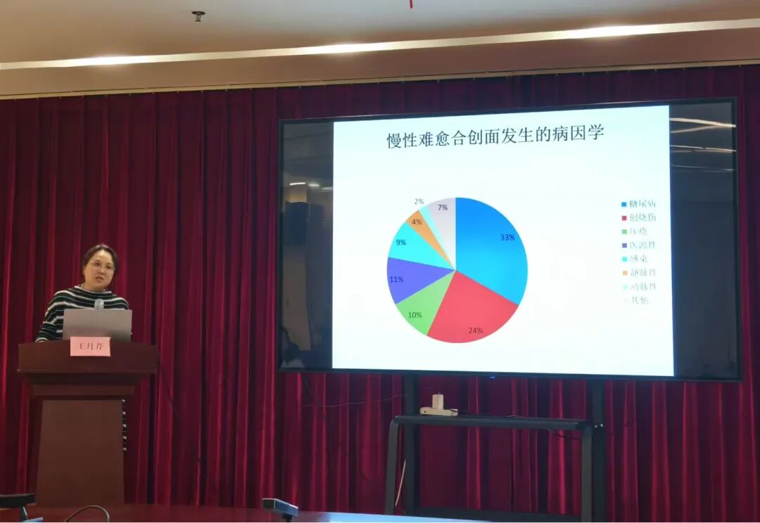 漯河市第三人民醫(yī)院新生兒科護士長馬麗明、漯河醫(yī)專二附院胸外科護士長丁亞楠共同主持,由河南省傷口造口專業(yè)委員會副主任委員、國際造口治療師王月芹教授主講的首場授課。王教授以《慢性創(chuàng)面治療策略》為題,深入淺出地講解了慢性創(chuàng)面治療策略核心是圍繞“病因控制-創(chuàng)面床準備-修復(fù)重建”三大核心環(huán)節(jié),通過多學(xué)科協(xié)作,動態(tài)調(diào)整方案以打破創(chuàng)面遷延不愈的惡性循環(huán)。王教授帶來最前沿的學(xué)術(shù)成果、用最鮮活的臨床案例和最實用的操作技巧。讓我們收獲解決實際問題的“金鑰匙”。