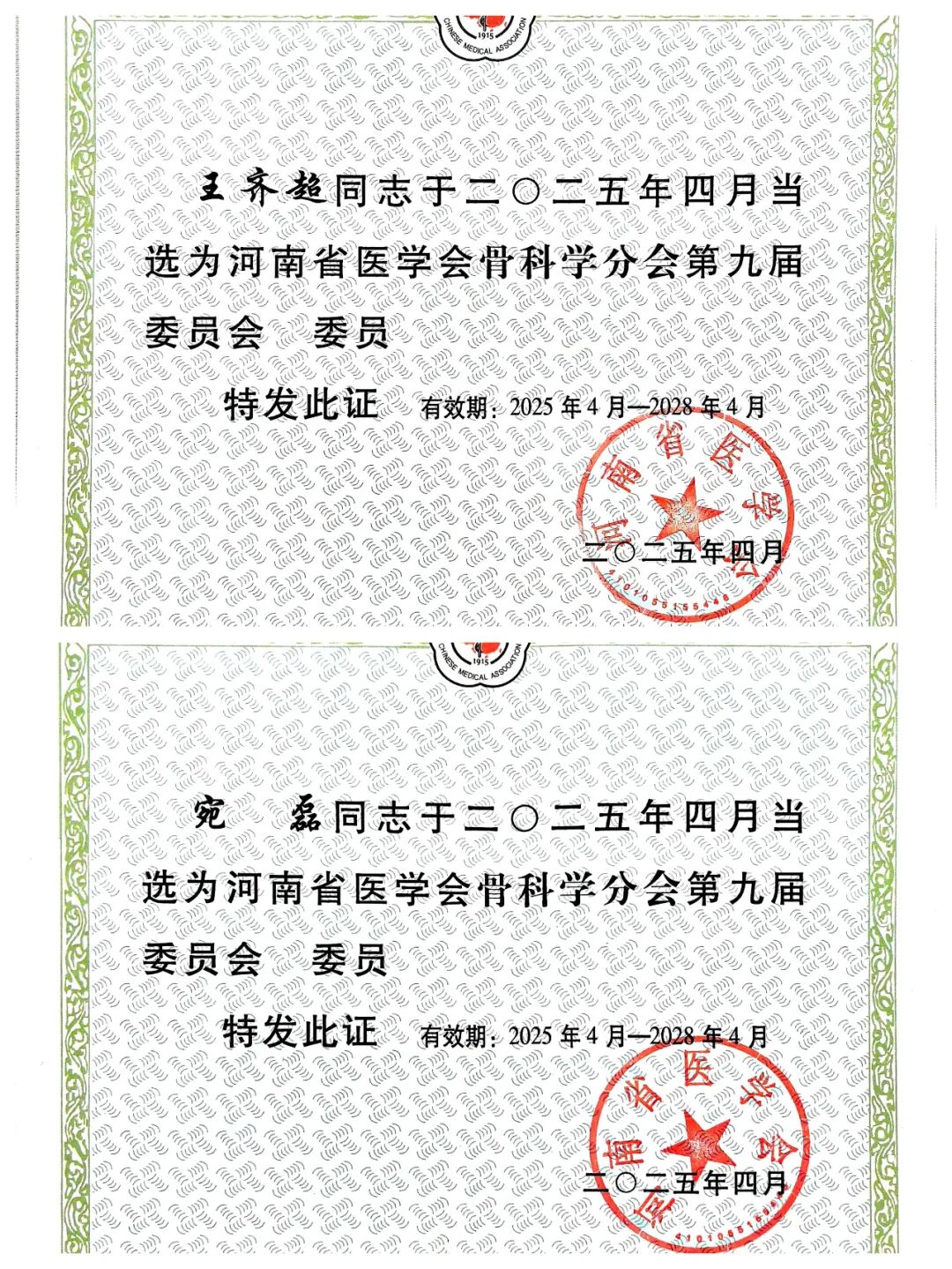 院長(zhǎng)王齊超、智能微創(chuàng)骨科主任宛磊分別當(dāng)選為河南省醫(yī)學(xué)會(huì)骨科學(xué)分會(huì)第九屆委員會(huì)委員。