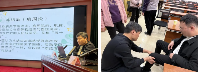 曹愛華主任強調(diào)了卒中防治的重要性,并針對職場人群常見的健康隱患,詳細講解了腦卒中的早期識別方法。同時,分享了高血壓、糖尿病、血脂異常等危險因素的科學(xué)管控方法,促使大家養(yǎng)成良好的飲食和生活習(xí)慣。宋松根副主任結(jié)合職工工作特點,重點講解了冠心病的防治、急性心肌梗死的典型癥狀及急救三步法,并分享了“控血壓、調(diào)血脂、控血糖、適度運動、堅持服藥”的ABCDE健康管理法則。金艷南副主任醫(yī)師則講解了肩周炎常見認識誤區(qū)、多種病因、“疼痛期、僵硬期、緩解期”三階段臨床表現(xiàn)和功能鍛煉的階梯方法,并現(xiàn)場示范了鐘擺運動、爬墻運動等簡單易行的預(yù)防鍛煉動作,從日常細節(jié)中守護關(guān)節(jié)健康。