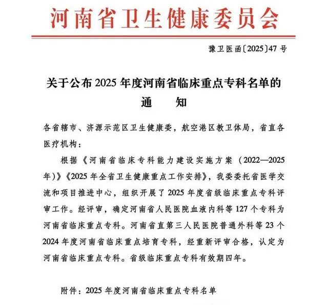 近日,河南省衛(wèi)生健康委發(fā)布《關(guān)于公布2025年度河南省臨床重點名單的通知》(豫衛(wèi)醫(yī)函〔2025〕47號),漯河醫(yī)專二附院(漯河市骨科醫(yī)院、漯河市立醫(yī)院)運動醫(yī)學(xué)科與護(hù)理??瞥晒νㄟ^評審被確定為河南省臨床重點??啤d鸷俞t(yī)專二附院再添兩個省級臨床重點???,標(biāo)志著這兩大??圃卺t(yī)療技術(shù)、科研創(chuàng)新、服務(wù)質(zhì)量及區(qū)域影響力等方面達(dá)到省內(nèi)領(lǐng)先水平。